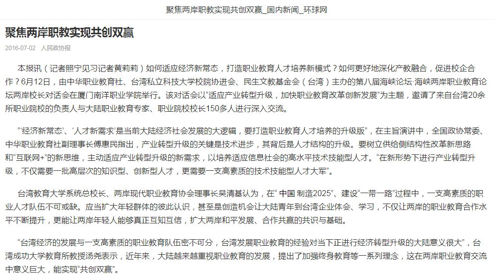 “台湾经济的发展与一支高素质的职业教育队伍密不可分,台湾发展职业教育的经验对当下正进行经济转型升级的大陆意义很大”,台湾成功大学教育所教授汤尧表示,近年来,大陆越来越重视职业教育的发展,提出了加强终身教育等一系列理念,这在两岸职业教育交流中意义巨大,能实现“共创双赢”。