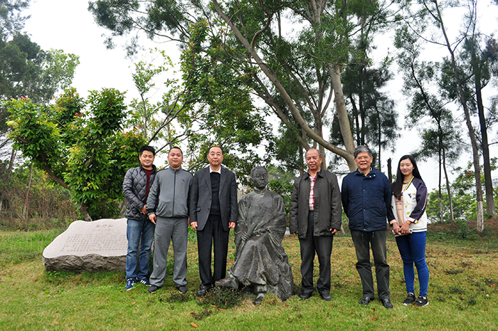 加拿大厦门海外联谊会名誉会长、厦门市陶行知研究会会长陈闽杰,厦门城市职业学院纪委书记易化一行与陶行知老先生雕塑合影。