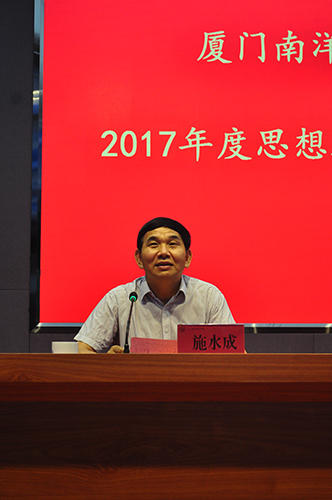 校长王豫生的主题报告回顾总结了2016年思想政治教育工作,分析研判当前思想政治教育工作新形势,研究部署2017年全校思想政治工作,助力学校高分通过二轮评估、争创省级文明学校和升本工作。他指出,2017年度学校思想政治教育工作,以抓好马克思主义理论教育为龙头,全面加强和提高学生思想政治教育的基础性、思想性和政治性,推动学生思想政治工作综合水平的整体性提高,进而达到全校教职工政治学习、理论学习的普及,推动全校教职工政治素养、理论水平的提高。王校长从以下六个方面深刻阐述了思想政治教育工作的必要性和重要性:马克思主义理论教育的定位与价值、马克思主义理论教育的演绎与发展、马克思主义理论教育的理论与基础、马克思主义理论教育的质量与效果、马克思主义理论教育的延伸与拓展、马克思主义理论教师的自立和自觉。