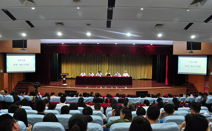 8月28日上午,以“转型、提升与发展”为主题的我校2017-2018学年第一学期全员培训班开班仪式在创业中心礼堂隆重举行,校领导王豫生、鲁加升、施水成、康乃美、潘世平、何卫华、张东宏等出席,党委书记施水成主持开班仪式并做动员报告。