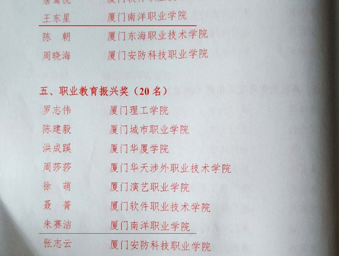 据了解,今年厦门共有611位优秀教师和教育工作者获得省、市表彰。厦门市教育局依旧设有13个单项奖,包括管理奖、创优奖、师德奖、职业教育振兴奖、校际交流奖、老骥奖等,共431名教职工获奖。我校王东星老师荣获高校优秀思政工作奖,朱赛洁老师荣获职业教育振兴奖。