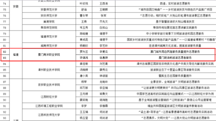 《2017年度万名旅游英才计划》系国家旅游局组织实施,并委托全国旅游管理专业学位研究生教育指导委员会(MTA教指委)秘书处和全国旅游职业教育教学指导委员会(全国旅游行指委)秘书处组织专家进行集中评审。我校青年教师许爱云和徐惠烨指导的项目《厦门城市周边民宿服务质量提升志愿服务》和《厦门鼓浪屿旅游志愿者服务》系该计划中的“实践服务型英才培养项目”。