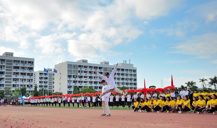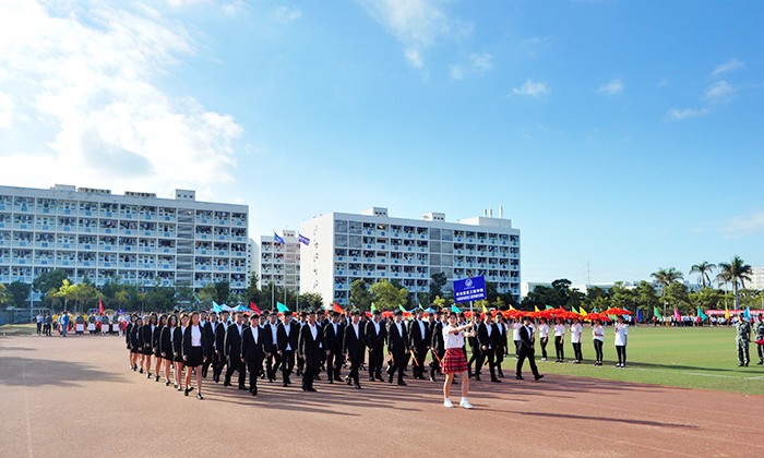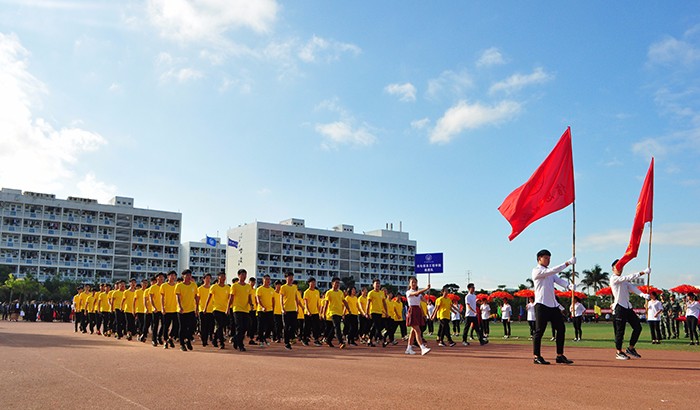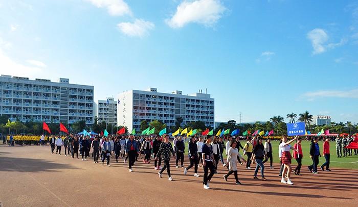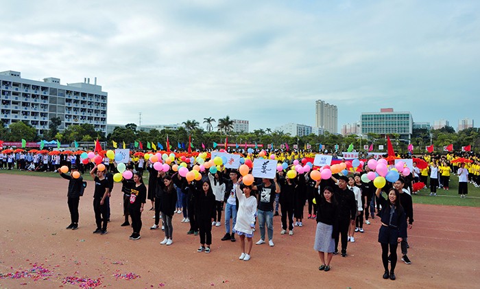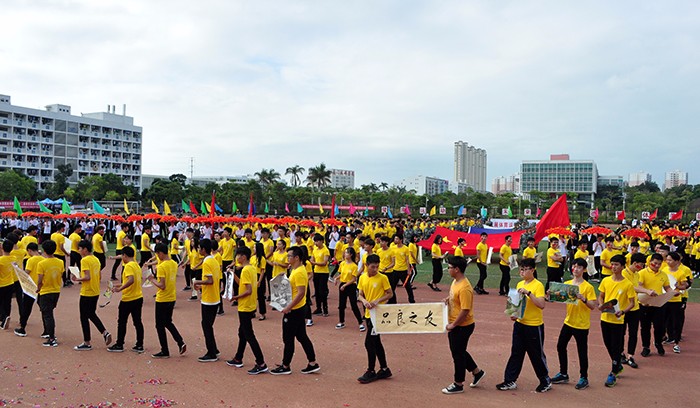 运动会在激昂的《运动员进行曲》中拉开帷幕,国旗方队、校旗方队、运动会旗方队、运动会标方队、运动会精神牌方队、彩旗方队、花束方队、裁判员代表队、教职工代表队及各二级学院代表队依次入场,整场开幕式热烈隆重,布局谋篇精心合理,设计运作创意求新,充满了昂扬向上、青春欢快、喜庆祥和的气氛。