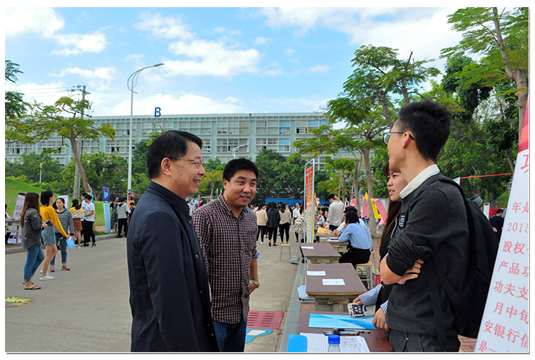 我校董事长、执行校长鲁加升来到招聘会现场,详细了解用人单位的需求。当他听到多家企业抱怨招聘会上根本抢不到毕业生时,亲切地支招儿:“那就现在就预定后年的毕业生吧。”