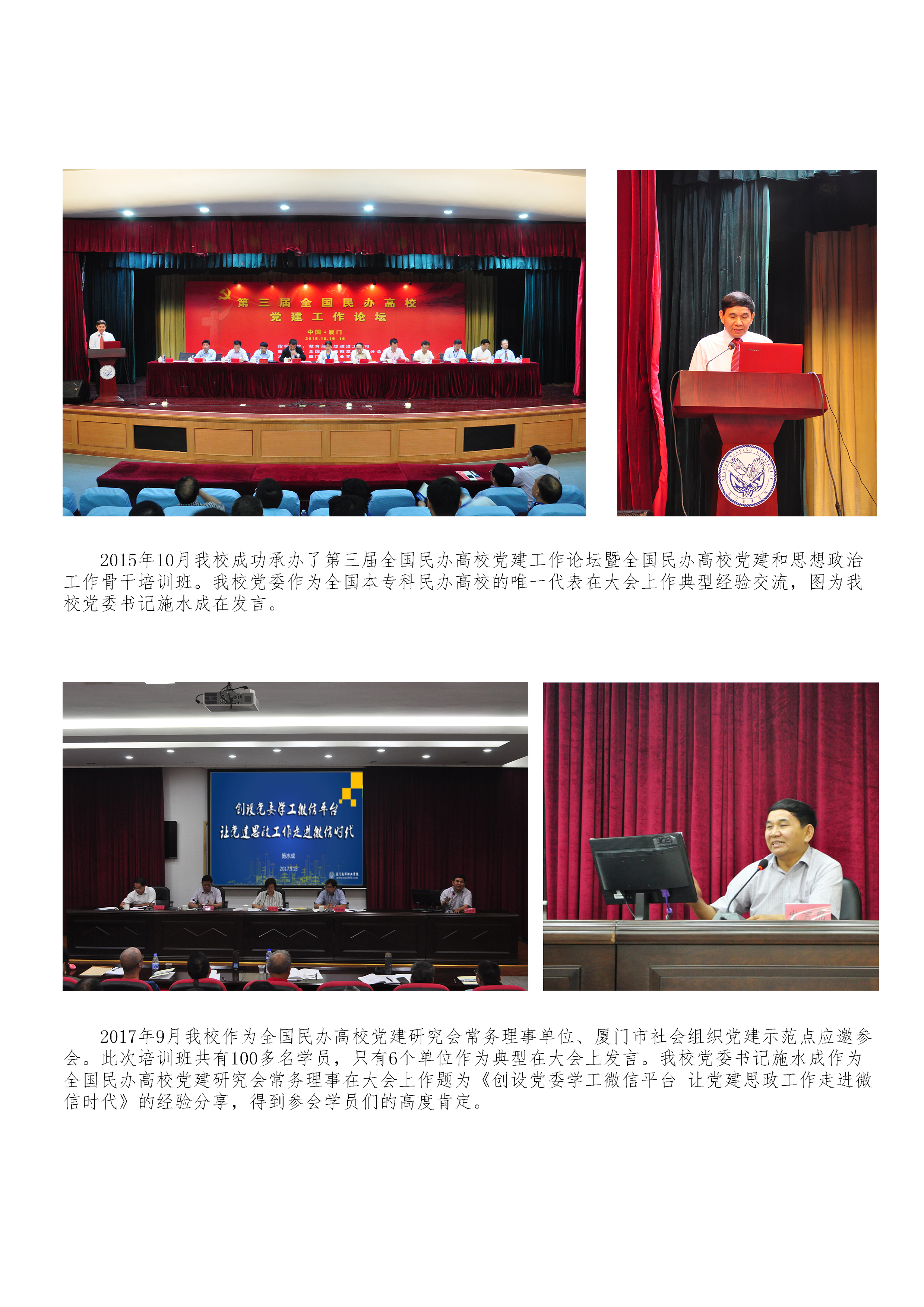 我校党委自成立以来,在省、市教育工委的领导下,紧紧围绕学校中心工作,切实履行民办高校党组织的各项职责,凝心聚力,发挥政治核心作用,助力了学校科学发展。作为福建省民办高校中唯一的全国民办高校党建、德育研究分会常务理事单位,我校党委主动作为,积极参与教育部思政司和全国民办高校党建研究会组织的各项活动,并取得了年度论文一等奖和研究成果特等奖等突出成绩,为福建民办高校争得了荣誉。此次评选,我校以党建工作基础扎实、不断创新,党建工作特色鲜明、亮点频出的优势入选。![]()
