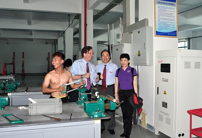 厦门南洋学院常务副校长康乃美陪同Tommy Bruce顾问一行先后参观了校史展览馆、图书馆、教学楼、实训楼。在校史展览馆,Tommy Bruce顾问一边参观一边询问南洋学院的办学理念。在图书馆,他用汉语“太棒了”不断表达着惊喜,当他看见天井被独具匠心地装饰成阅读区时高兴地表示,这跟纽约大学的图书馆一样;当他看到墙上从古到今的名人画像和名人小故事时赞叹道,这种会讲故事的建筑最吸引人。在教学楼,经济管理学院肖亮老师正在给学生讲授人力资源管理课,Tommy Bruce顾问一行走进教室,同学们热情地打着招呼,Tommy Bruce顾问一边回应同学们一边说,太羡慕南洋的学生了,能在这么美丽的校园里学习生活。走出教学楼, Tommy Bruce顾问一行来到位于实训楼一楼的实训车间,一群正在操作机器的学生热情地跟康乃美常务副校长打着招呼,旁边一名院长正满头大汗地带着学生修理机器,Tommy Bruce顾问感叹道,南洋学院的校长、院长怎么跟学生像哥们儿一样啊!在橱柜学院,他饶有兴致地参观着、询问着;在模拟机舱,他兴奋地在“南洋号”机舱前留影。