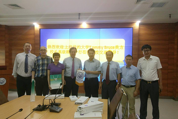 参观完校园,厦门南洋学院董事长、执行校长鲁加升教授在图书馆一楼会议室与Tommy Bruce顾问一行举行会谈。