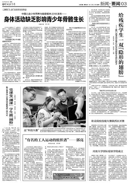 编者按:2018年5月21日出版的《中国教育报》第三版在头条位置刊登厦门南洋学院培养残疾学生成长成才的通讯《给残疾学生一双“隐形的翅膀”》,全文1400字,通过对林玉凤、林婕、叶建凡三名残疾学生在校学习生活的描写,反映了南洋学院以人为本,让残疾学生的人生也一样出彩的办学理念。详情请链接: