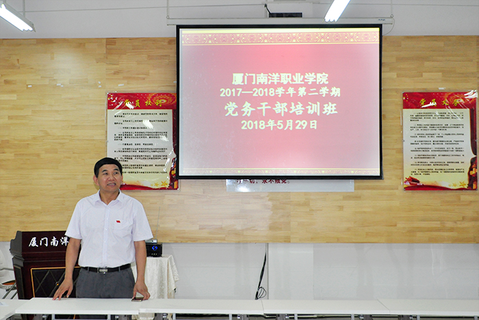 5月29日下午,厦门南洋学院2017-2018学年第二学期党务干部培训班开班,党委书记施水成讲话,党委委员、副校长何卫华授课,党务科副科长吴艺强主持,全校57名党务干部参加培训。