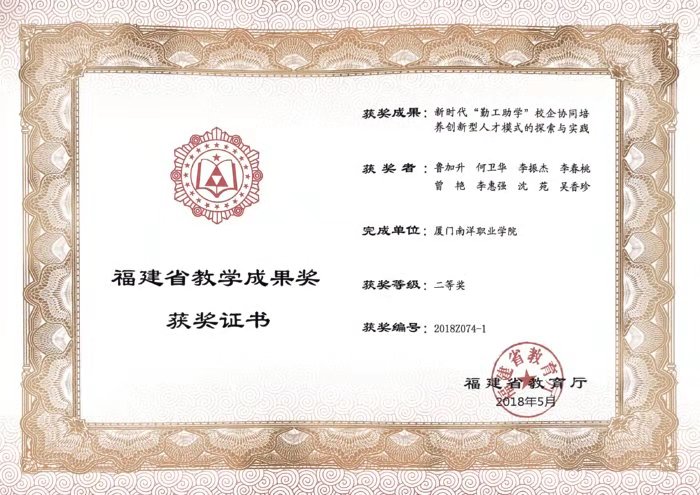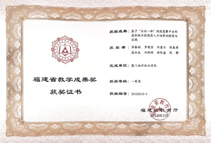 近日,福建省教育厅公布2018年省级教学成果奖获奖项目,厦门南洋学院李春桃、罗晓芳、许爱云等的成果“基于‘五位一体’技能竞赛平台的高职技术技能型人才培养的探索与实践”和鲁加升、何卫华、李振杰等的成果“新时代‘勤工助学’校企协同培养创新型人才模式的探索与实践”分别荣获2018年职业教育省级教学成果奖一等奖和二等奖。这也是厦门南洋学院在这个奖项中取得的历史最好成绩。