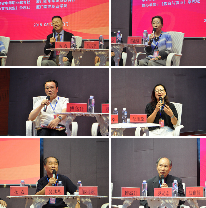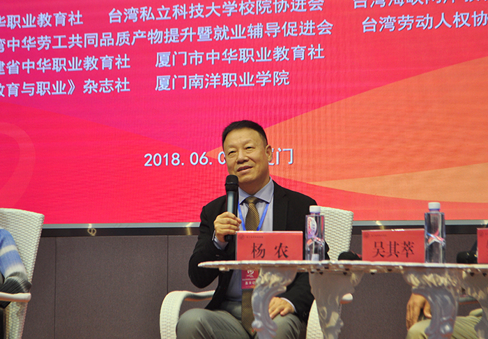 在校长对话环节,中华职业教育社党组成员、副总干事杨农牵头组织来自两岸的5位职业院校负责人围绕全人教育理念进行对话。