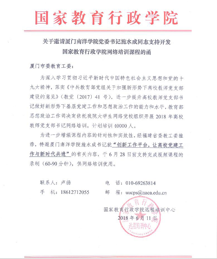 昨日(6月11日),国家教育行政学院受教育部思政司委托,向厦门市委教育工委发出邀请函,邀请厦门南洋学院党委书记施水成支持开发国家教育行政学院网络培训课程,就“创新工作平台,让高校党建工作与新时代共进”的有关内容,录制视频课程。