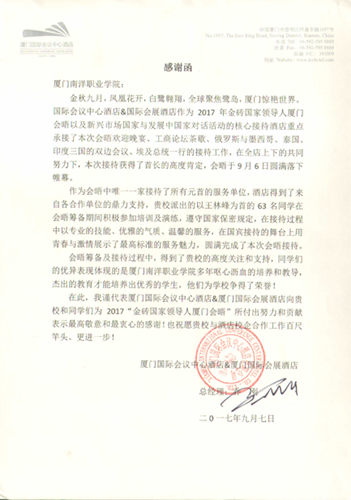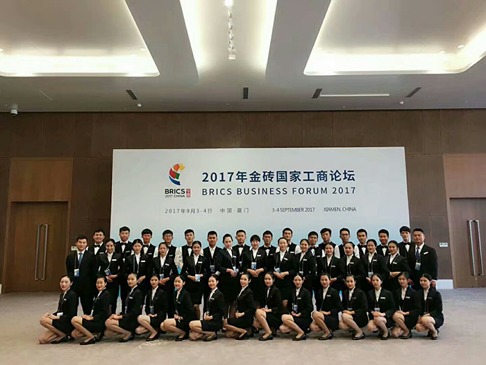 2017年9月。厦门成为全球瞩目的城市。在这里举行了金砖国家领导人第九次会晤,南洋学院共有63名学生参与其中的接待工作,他们主要来自外旅学院和机电工程学院,许爱云和丛义霞两位老师全程参与,冯晨和马振宇两位老师鼎力相助,从2017年4月的面试选拔,到5月的理论培训,再到6月的刻苦练习,以及后来7月和8月的正式入住酒店封闭训练,最后在9月3日到5日分配到国宴的不同区域,完美呈现,参与了国际规格的会议接待,受到企业的一致好评,为学校争得了荣誉。这是学校和企业的深度融合,也是人才培养工作的重大突破。