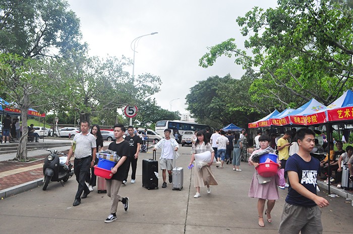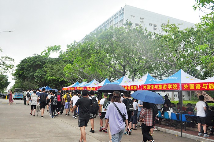 2018级新生第一天报到就遇到小雨天气,但南洋学院学工、后勤等职能部门和各二级学院制订了详细的接待方案及应急预案,各项迎新工作有序进行,新生及家长对学校非常满意,这使得一段时期以来流行在南洋校园里的“风里雨里,我在南洋等你”成了一句最浪漫的迎新标语。