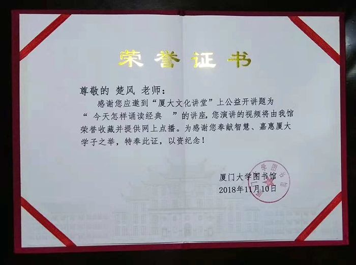 肖亮老师的讲座视频已由厦门大学图书馆荣誉收藏并提供网上点播,目前观看数已超过2400人次。肖亮老师也因奉献智慧、嘉惠厦大学子之举,被厦门大学图书馆授予荣誉证书。