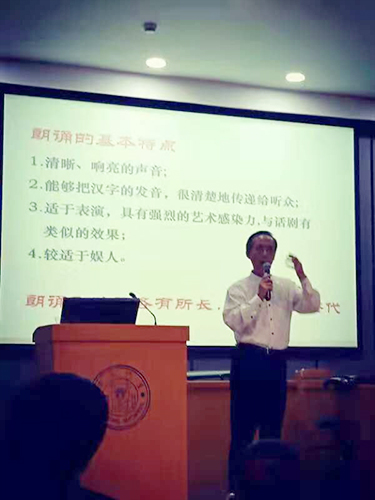 在“厦大文化讲堂”上,肖亮老师作了题为“今天怎样诵读经典”的讲座,不仅讲解朗诵的基本特点,向观众普及有关吟诵与朗诵的相关知识,还声情并茂地吟诵了范仲淹名篇《岳阳楼记》。细致的讲解和精彩的示范,引领听众发现汉语之美,更好地熟悉诗词歌赋、亲近中华经典,深刻领悟中华传统文化的精髓。