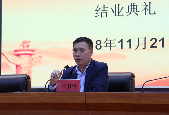 何卫华副校长在讲话中向本期党校培训顺利结业的学员表示热烈祝贺,并提出两点希望:一是坚定理想信念,树立远大志向,不忘初心,争取早日加入中国共产党;二是严于律己,切实发挥积极分子的表率作用。他指出,本期党校共有121名学员参加培训,74名学员通过考核获得结业证书。结业的学员要不断加强党性修养,牢固树立终身学习的理念,始终坚持用党的理论武装自己;未结业的学员要向优秀学员学习,端正入党动机,通过自己不懈努力,争取早日加入党组织。
