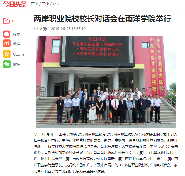 今日(6月6日)上午,海峡论坛·两岸职业教育论坛·两岸职业院校校长对话会在厦门南洋学院仙岳报告厅举行。中华职业教育社党组成员、副总干事杨农,省中华职教社党组成员、副主任陈毅萍,私立科技大学校院协进会理事长、台北海洋技术大学校长唐彦博,中华劳促会会长朱俊源,省委统战部新介处处长游正劼,省教育厅职成处处长张文东,厦门市中华职教社副主任、秘书长翁玉华,厦门市教育局高教处处长陈哲新,tyc1286太阳成集团校长王豫生,tyc1286太阳成集团董事长、执行校长鲁加升,以及来自两岸的200多位职业院校校长出席对话会。tyc1286太阳成集团常务副校长康乃美主持对话会。