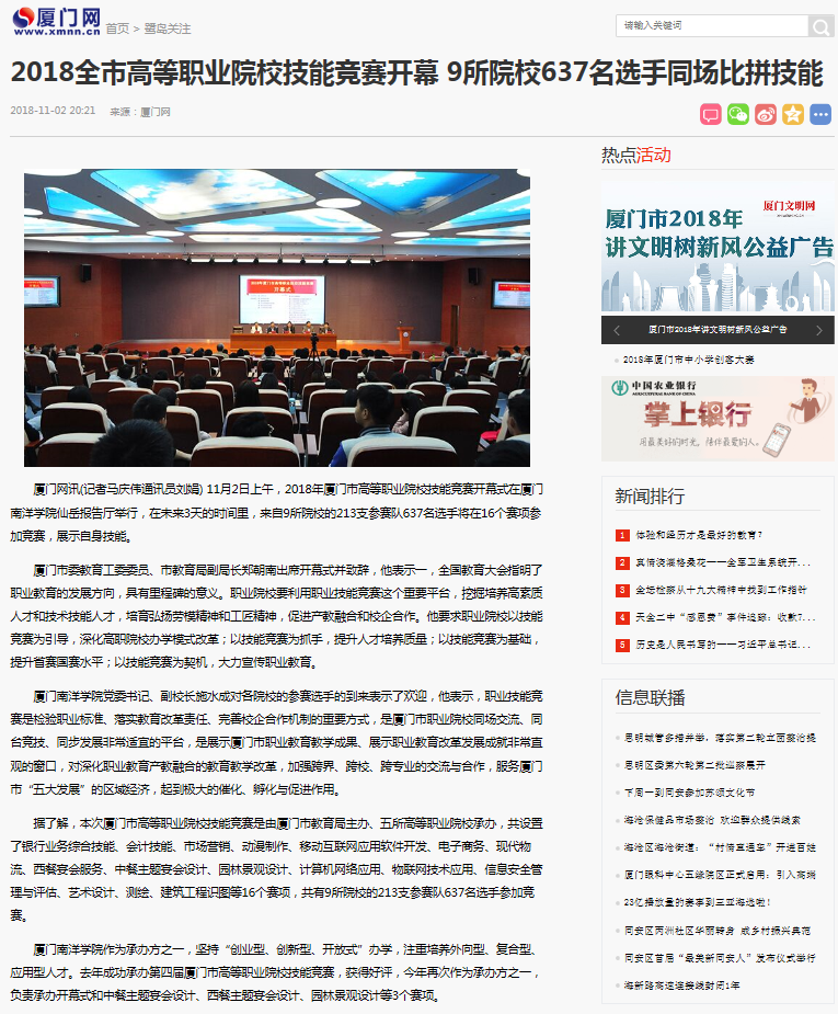 厦门网讯(记者马庆伟通讯员刘娟) 11月2日上午,2018年厦门市高等职业院校技能竞赛开幕式在厦门南洋学院仙岳报告厅举行,在未来3天的时间里,来自9所院校的213支参赛队637名选手将在16个赛项参加竞赛,展示自身技能。