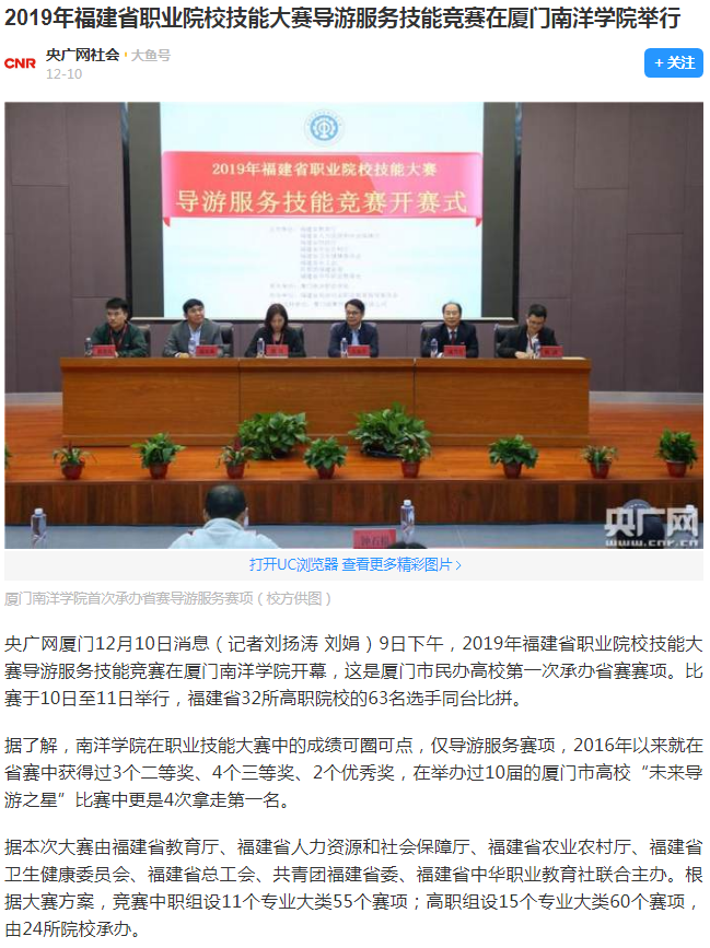 央广网厦门12月10日消息(记者刘扬涛 刘娟)9日下午,2019年福建省职业院校技能大赛导游服务技能竞赛在厦门南洋学院开幕,这是厦门市民办高校第一次承办省赛赛项。比赛于10日至11日举行,福建省32所高职院校的63名选手同台比拼。
