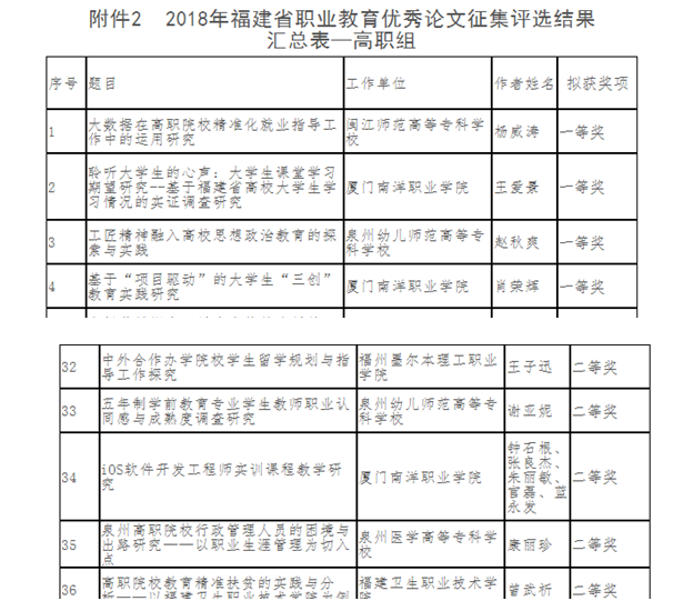 本次参评2018年度福建省职业教育优秀论文共856篇,经省职业技术教育中心组织专家评审,评选出一等奖86篇(中职70篇、高职16篇),二等奖173篇(中职138篇、高职35篇),三等奖251篇(中职199篇、高职52篇)。福建省职业教育优秀论文评选宗旨在于促进全省职业教育理论研究、办学经验总结、教育教学改革创新,推动广大教师积极探索职业教育教学理论,切实提高职业院校教育教学质量。