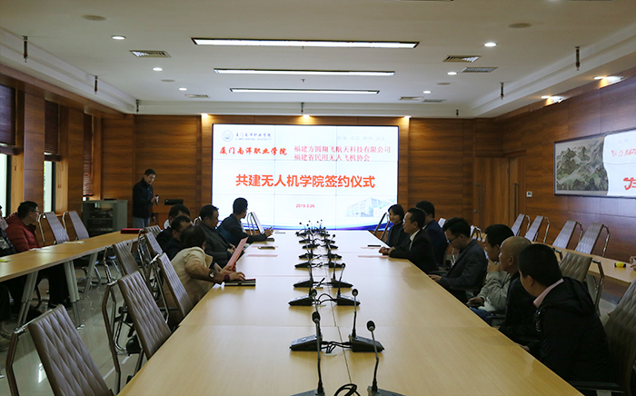南洋社讯 昨日(3月26日)下午,厦门南洋学院与福建省民用无人机协会 “无人机学院”合作共建签约仪式在第一会议室举行。南洋学院董事长、执行校长鲁加升,福建省民用无人机协会会长李建军,常务理事柏彬出席签约仪式。校长助理、教务处处长钟石根、机电学院相关负责人、部分无人机专业师生代表参加仪式。