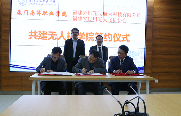 李建军会长向与会人员介绍了国内无人机产业发展情况及无人机在行业应用的背景,高度认可了南洋学院产学研人才培养模式。在双方签署合作协议后,鲁加升董事长宣布无人机学院正式成立,厦门南洋学院与福建省民用无人机协会、福建方圆翔飞航天科技有限公司“校、企、会”合作正式落地。