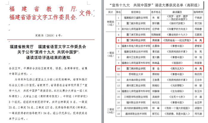 南洋社讯 4月12日,福建省教育厅和福建省语言文字工作委员会下发表彰文件,公布“宣传十九大 共筑中国梦”诵读大赛评选结果,厦门南洋学院斩获2个一等奖,教师肖亮荣获“优秀指导教师”。