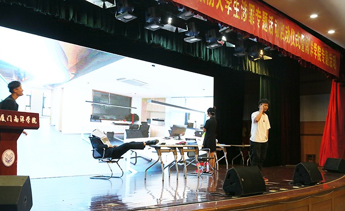 本次活动形式新颖,除了现场发放翔安区检察院原创的《预防大学生涉罪“三字诀”》宣传手册之外,还采取同学们喜闻乐见、易于接受的形式,拉近法律与学生之间的距离,通过播放抵制非法校园贷概念动画、两个专题法治情景剧和4个互动小游戏等移动教学、互动普法,给学生们上了一堂生动的法治课。