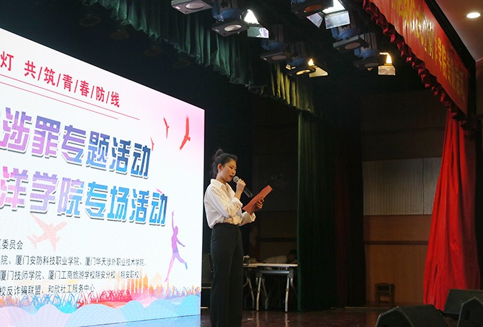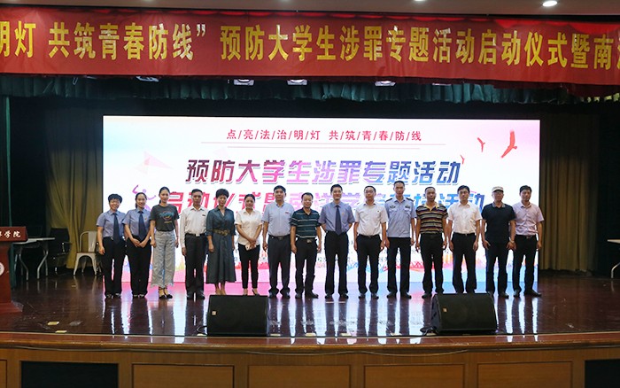 南洋社讯 4月28日下午,由翔安区检察院、翔安团区委等联合举办的“点亮法治明灯,共筑青春防线”预防大学生涉罪专题活动在厦门南洋学院活动中心礼堂启动。翔安区政法委副书记洪国煌,翔安区检察院副检察长吴筱云,翔安团区委书记郭闻文,翔安区新店镇派出所副所长蔡锡,工商银行翔安支行副行长方大任,南洋学院党委书记施水成,副校长何卫华及其他7所大中专院校代表出席仪式。各党总支书记、学工处相关负责人及部分学生参加仪式。