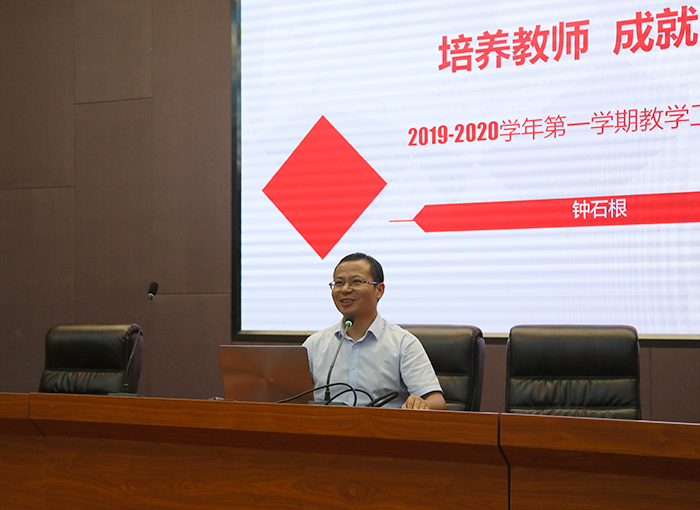 钟石根校长助理以“培养教师成就学生”为题,从学校目标、学院工作、教师发展、学生成长、申本工作五大方面对2019-2020学年第一学期的教学工作进行详细的安排布置,并具体分析了每个重点工作的执行方法和开展情况。