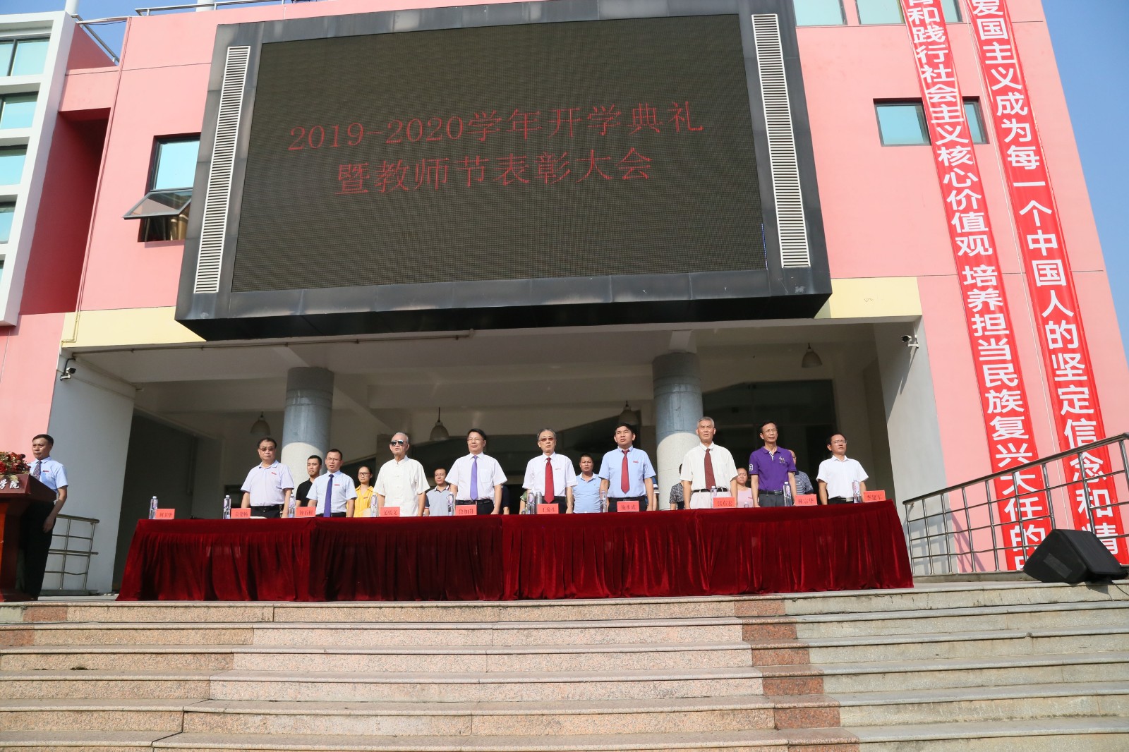 南洋社讯 今日(9月9日)下午16:00,多架酷炫的无人机在厦门南洋学院时代广场上空翻转盘旋,精彩绝伦无人机飞行技能表演拉开了南洋学院2019级新生开学典礼的序幕。校领导鲁加升、王豫生、施水成、张东宏、何卫华、钟石根及嘉宾范骏义、李建军出席典礼,各二级学院和职能部门负责人、教师代表、2019级全体新生参加典礼。校长王豫生致辞,董事长、执行校长鲁加升作总结讲话,党委书记施水成宣读表彰决定,副校长何卫华主持典礼。