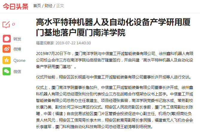 2019年7月20日下午,厦门南洋学院与中信重工开诚智能装备有限公司、徐州鑫科机器人有限公司校企合作三方在南洋学院仙岳报告厅隆重签约,开启共建“高水平特种机器人及自动化设备产学研用厦门基地”。