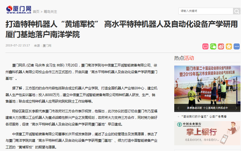厦门网讯 (记者 马庆伟 实习生 林昕) 7月20日,厦门南洋学院与中信重工开诚智能装备有限公司、徐州鑫科机器人有限公司校企合作三方正式签约,开启共建“高水平特种机器人及自动化设备产学研用厦门基地”。