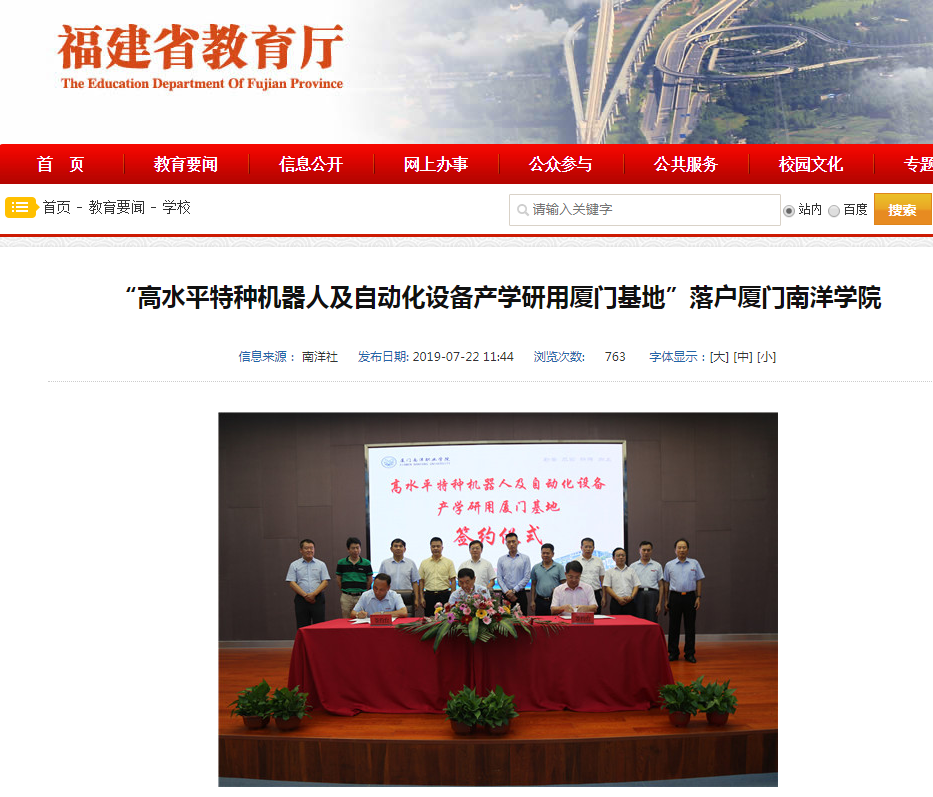 签约仪式上,翔安区人民政府副区长李毅指出,此次协议的签订不仅是厦门南洋学院的大事、盛事,也是厦门高职教育的喜事、要事,更是厦门经济社会发展的一件美事、好事,因为这顺应了新时代创新驱动发展战略,践行了国家职教改革精神,切合厦门市乃至福建省大力发展以工业机器人为重点战略性新兴产业之发展规划。政府将大力支持三方合作,同时努力做好各项服务,促使“高水平特种机器人及自动化设备产学研用厦门基地”早日建成。