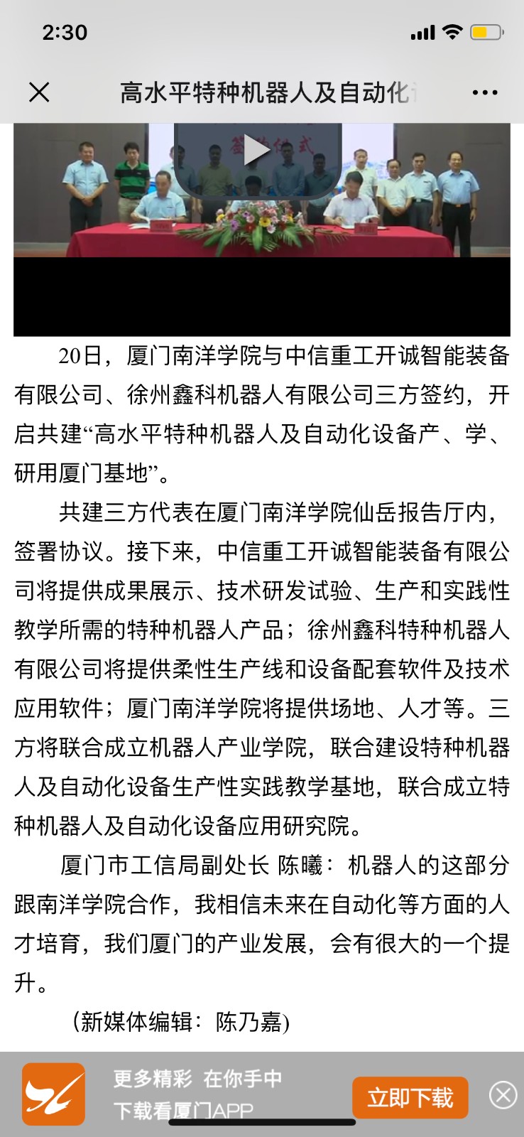 看厦门:“高水平特种机器人及自动化设备产学研用厦门基地”落户厦门南洋学院