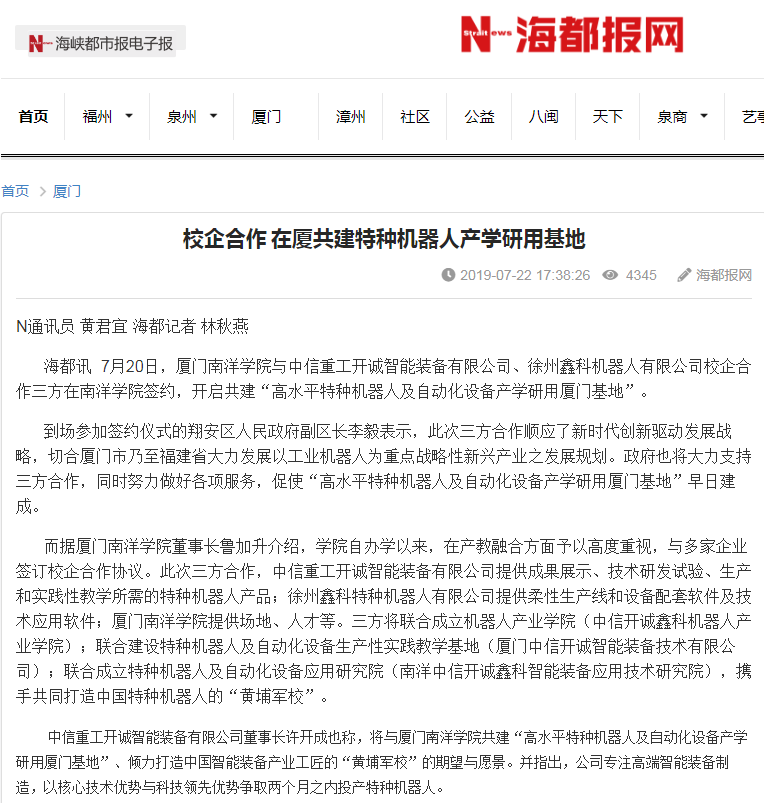 海都讯 7月20日,厦门南洋学院与中信重工开诚智能装备有限公司、徐州鑫科机器人有限公司校企合作三方在南洋学院签约,开启共建“高水平特种机器人及自动化设备产学研用厦门基地”。