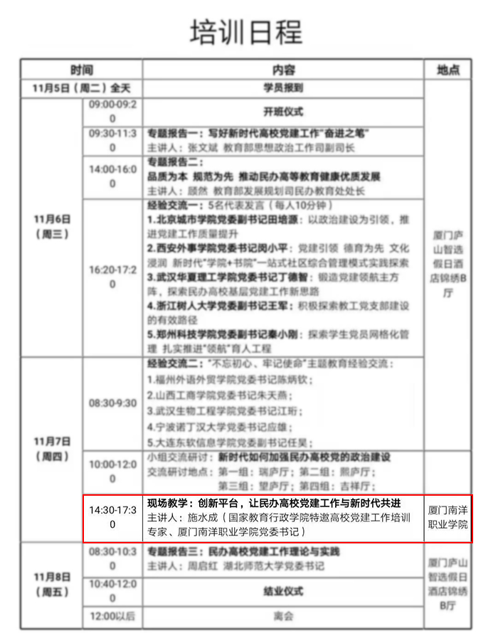 南洋社讯 昨日(11月7日)下午,南洋学院党委书记施水成应教育部思政司之邀,为全国高校思政工作骨干示范培训班100名学员作专题报告并获高度肯定。