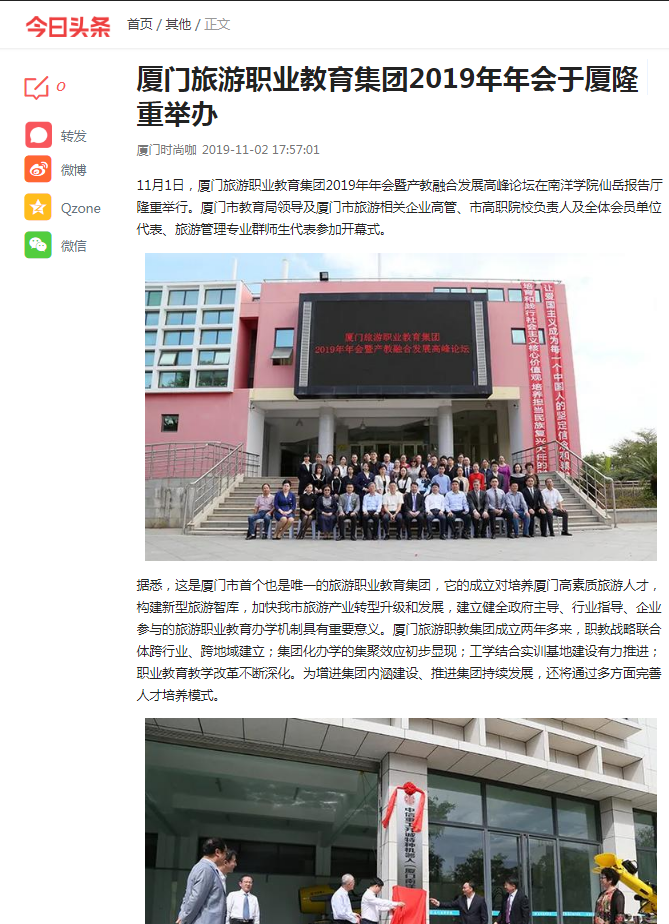 11月1日,厦门旅游职业教育集团2019年年会暨产教融合发展高峰论坛在南洋学院仙岳报告厅隆重举行。厦门市教育局领导及厦门市旅游相关企业高管、市高职院校负责人及全体会员单位代表、旅游管理专业群师生代表参加开幕式。