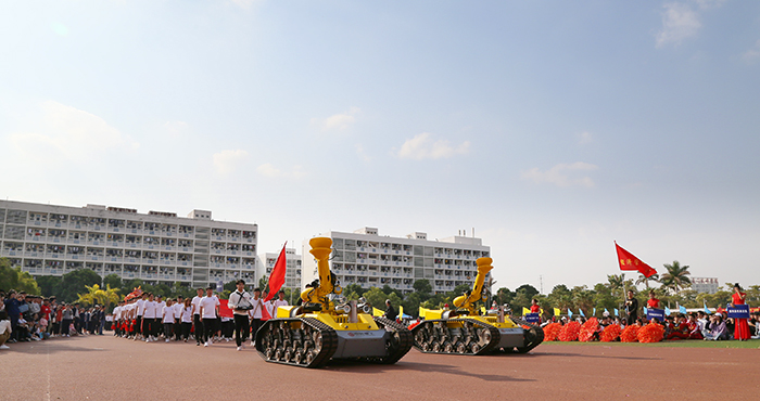 伴随着雄壮的运动员进行曲,鲜艳的国旗队引领着校旗队缓缓走过主席台,彩旗花束方阵紧随其后,将田径场装点得五彩缤纷。18个由各学院学生、裁判、教师组成的方阵踏着铿锵的节奏,迈着坚定的步伐,气宇轩昂、意气风发,依次走过主席台接受检阅。本届运动会各个方阵在入场秀上脑洞大开,用天马行空的创意展现班级魅力,为新中国成立七十周年献礼。形式多样、个性张扬、精彩纷呈:有在衣服上玩创意的;有在道具上拼新意的;有戴着卡通面具玩花样的;有团体表演活力十足舞蹈《燃烧我的卡路里》《野狼Disco》的;有挥舞红旗合唱《我的中国心》的。酷炫无人机、消防机器人、灵活手指舞、舞龙舞狮、复古前卫舞蹈等花式入场轮番上演、博足眼球,充分展示了各学院的特色和南洋师生奋发拼搏、积极向上的精神面貌。