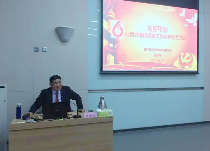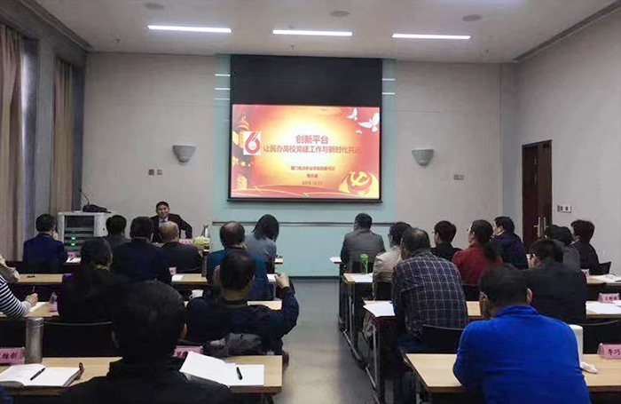 施水成书记以《创新平台,让民办高校党建工作与新时代共进》为题,分别从加强顶层设计、夯实组织基础、创新工作平台三个方面谈起,把南洋学院近年来党建思政工作实践中的好经验、好做法作为鲜活案例,详细介绍了我校党委不忘初心,积极发挥党组织政治功能,努力建好六大平台,并不断探索新型党建工作法,把思想政治引领与教育教学实践有机结合,让民办高校党建工作与新时代共进,助力并确保学校健康科学发展。