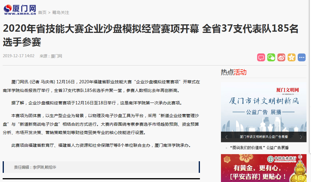 此赛项由福建省教育厅、福建省人力资源和社会保障厅等8个单位联合主办,厦门南洋学院承办。