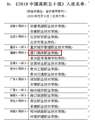 南洋社讯 1月9日至10日,2019第五届《中国职业教育百强》评选活动在北京大学隆重举行,厦门南洋学院成功入榜“2019中国高职50强”,是厦门市唯一获此殊荣的高职院校,也是福建省入选的两所高校之一。