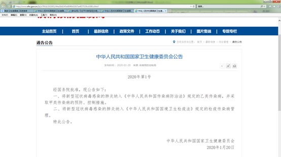 将新型冠状病毒感染的肺炎纳入《中华人民共和国国境卫生检疫法》规定的检疫传染病管理。