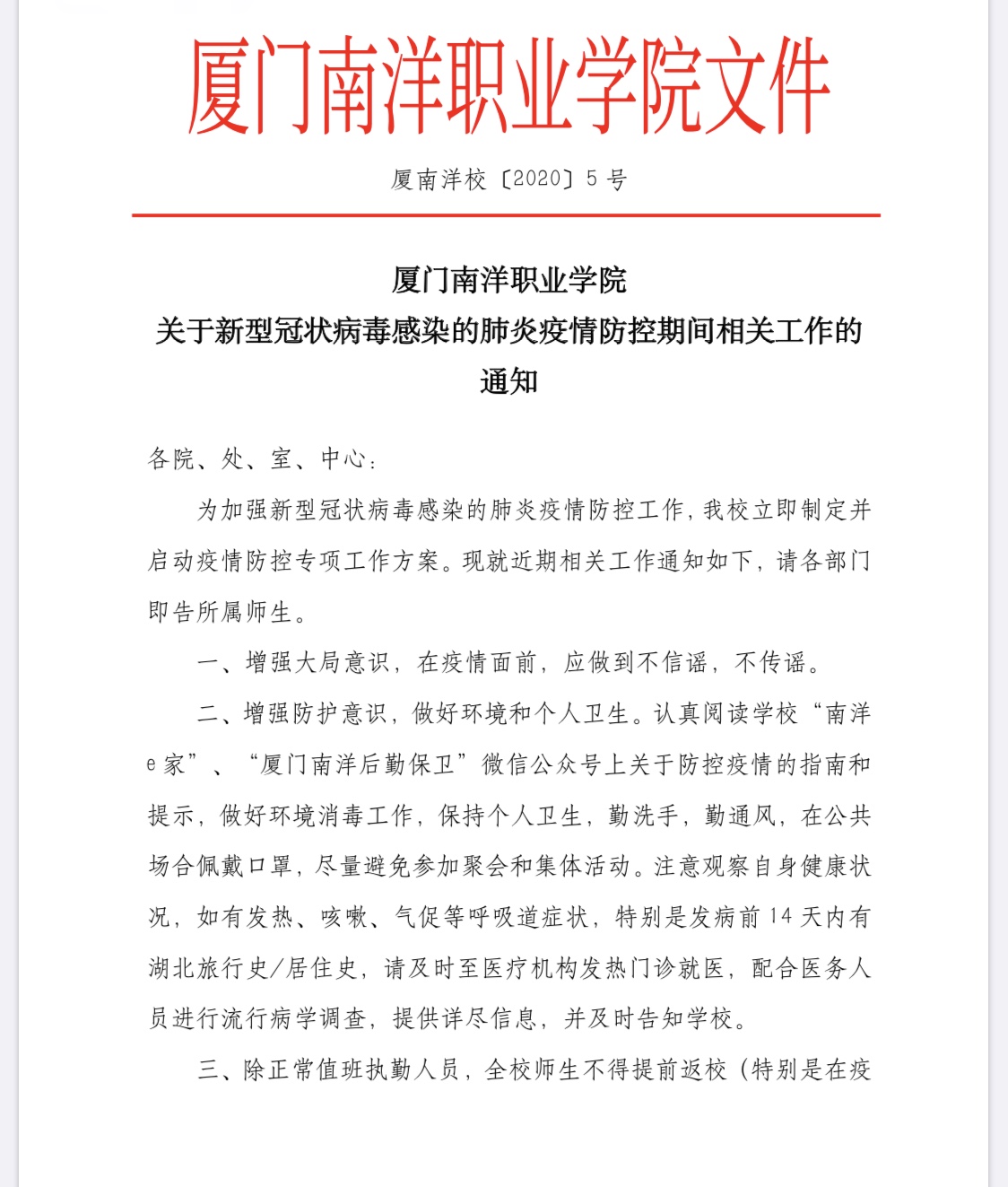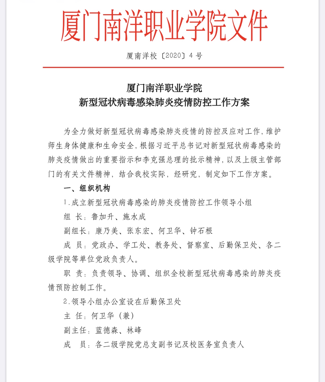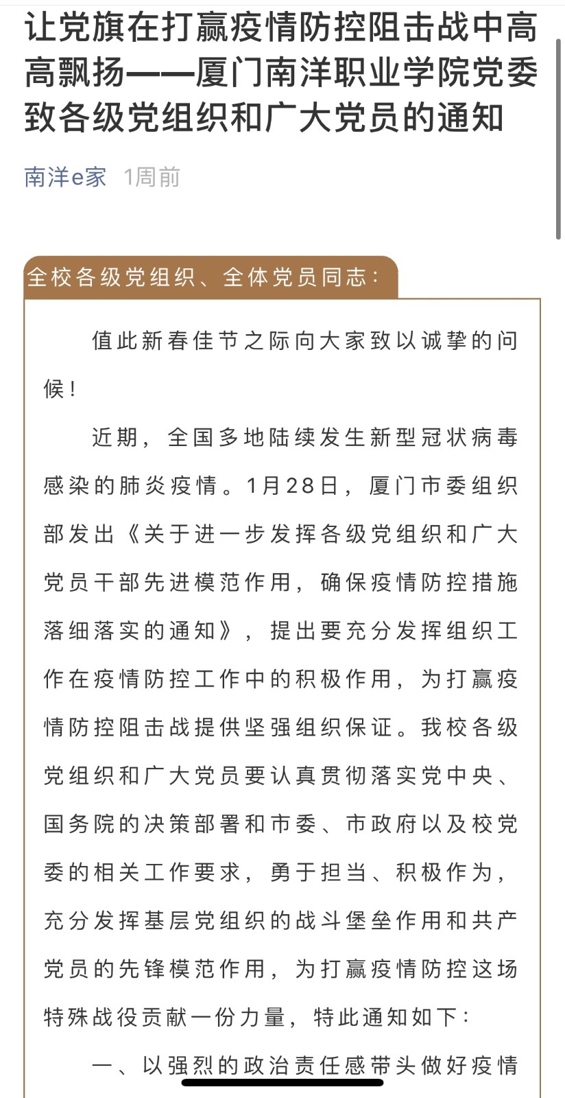 加强组织领导 落实防控责任。为认真贯彻习近平总书记“疫情就是命令,防控就是责任”的重要讲话精神,全面落实福建省教育厅、厦门市教育局关于疫情防控的各项工作要求,南洋学院董事会、党委、行政主要领导高度重视,第一时间紧急召开疫情防控线上协调会,成立了以董事长、校长鲁加升及党委书记施水成任组长的疫情防控领导小组,统一部署,精准施策,迅速制定疫情防控工作方案并于1月26日下发全校,1月 28日起实行校园封闭管理,坚决阻断疫情向校园蔓延。