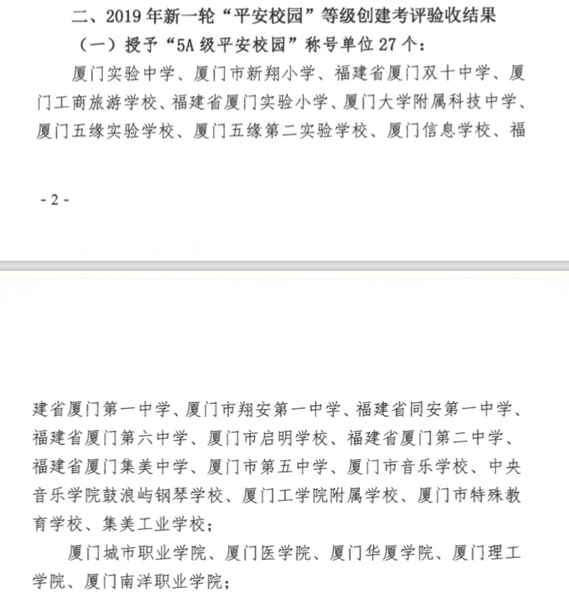 南洋社讯 近日,厦门市教育局公布2019年新一轮平安校园等级创建和学校综治安全目标管理责任考评结果,厦门南洋学院成功获评“2019年学校综治安全目标管理责任考评优秀单位”及“5A级平安校园”称号。