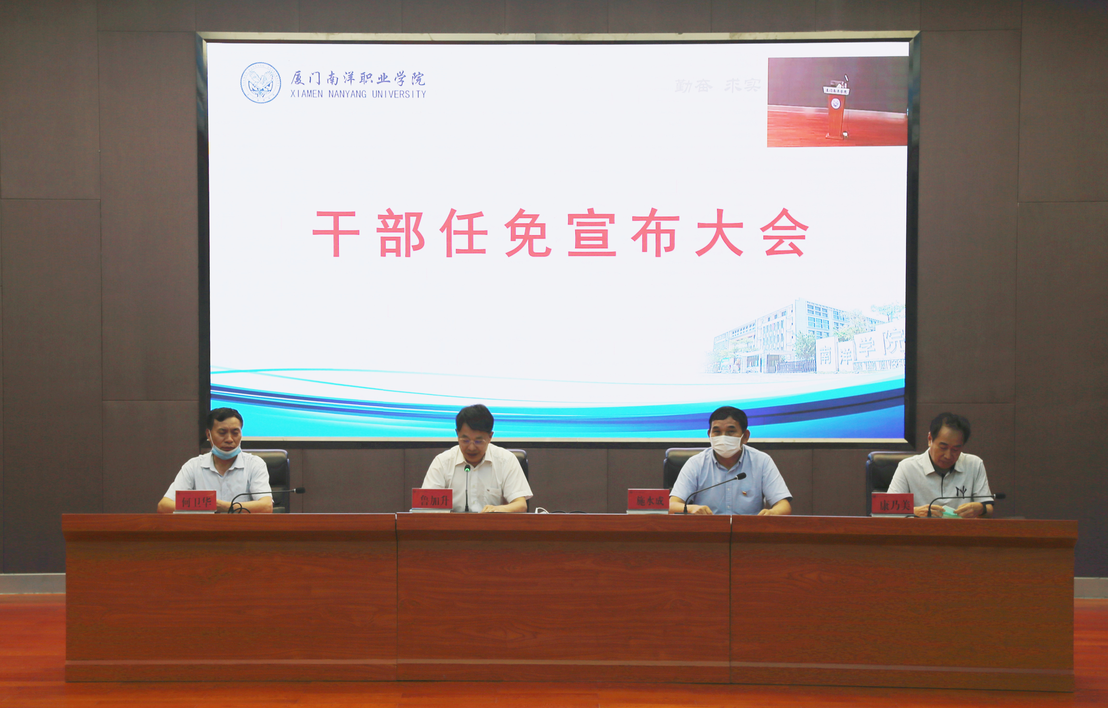 董事长、校长鲁加升教授代表董事会宣布鲁晓芹同志任副董事长,钟石根同志任副校长,李振杰同志任校长助理;免去张东宏同志的副校长职务,钟石根同志的校长助理职务的通知;党委书记施水成教授代表校行政和党委宣布关于张东宏等同志职务任免和杨大进任职的通知。
