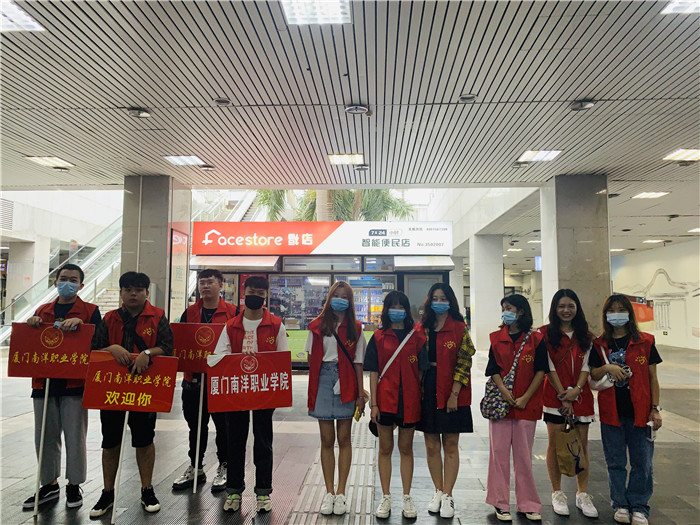 今天一大早,艺术设计学院的辅导员郭锦霖就带着艺术学院的学生干部在厦门北站迎接新生的到来,早上天公不作美,接站的师生就淋着雨给新生搬行李;中午的时候又顶着大太阳,带着学生、家长休息,吃饭。