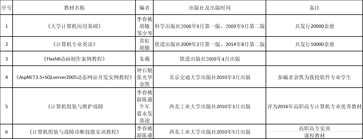 由于当时南洋学院尚在起步发展阶段,除教学工作外,学校仍立足于高等学校两个中心的理念,并行的开展了科学研究工作,主要是大力组织开展高职教育理论与实践的研究,并取得了可喜的成果。本着学校的实际情况,我在担任信息工程学院院长期间,就果断的选择了抓教材建设这一环节,组织教师和技术人员,积极的编写适合于我们自身教学要求的教材,从而展开了我们从事科学研究的局面。首先我们选定了全校各专业都要开设的《计算机应用基础》课程,并结合当时计算机等级考试大纲,力求二者融为一体,编写《大学计算机应用基础》这本高职高专规划教材,既要满足教学大纲的要求,又要满足等级考试培训任务的要求,这本教材由主讲教师李春桃、胡敏、邹少琴合力编写,经过近一年时间的努力,终于完稿,并由科学出版社审定后于2006年9月正式出版,率先在南洋学院出版了第一本教材。此后又组织常虹、胡敏两位教师编写了当时比较稀缺的高职专业的《计算机专业英语》;朱薇老师编写了当时比较热门的《Flash8动画制作案例教程》两本教材,均由铁道出版社审定后于2009年2月和4月正式出版。编写这三本教材的五位教师都是二十几岁的青年教师,实属难得。教材的编写大大提高了她们的专业能力和教学水平,同时也使她们更加明确了作为一名大学教师肩负的责任。