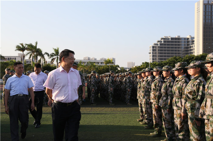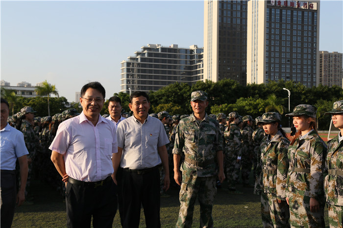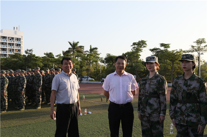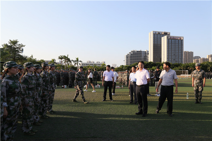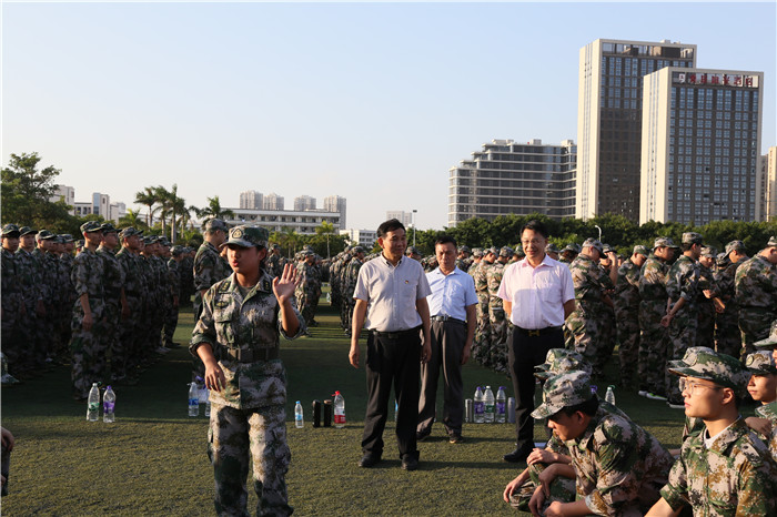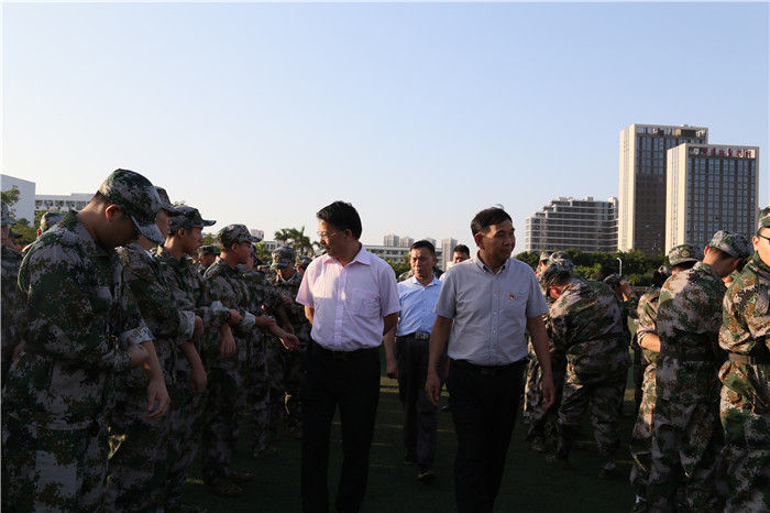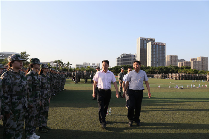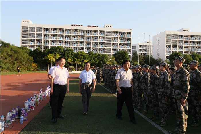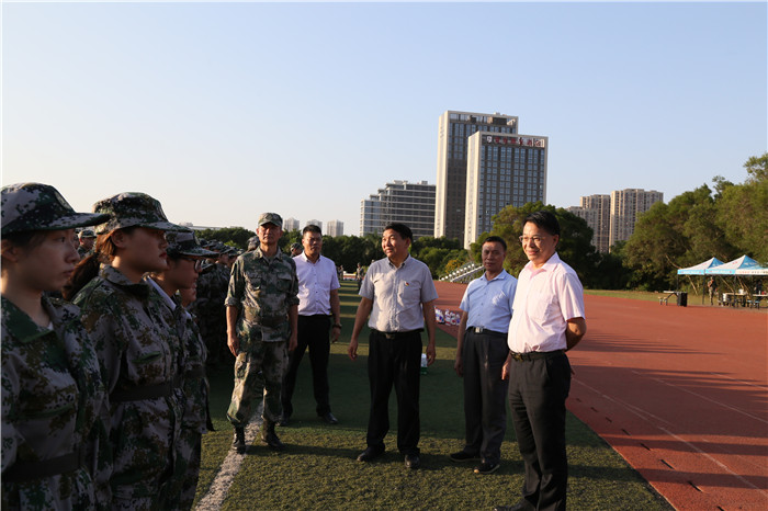 10月9日下午,头顶炎炎烈日,董事长、校长鲁加升教授,党委书记施水成深入2020级三年制大专新生军训场地了解各项工作,亲切慰问军训教官和新生。